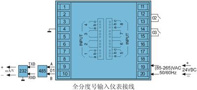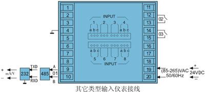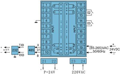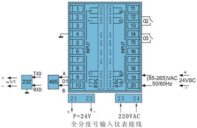 *本儀表的以下功能只能選擇其中一項(xiàng):變送輸出;RS232通訊;RS485通訊;帶微型打印機(jī)通訊接口。